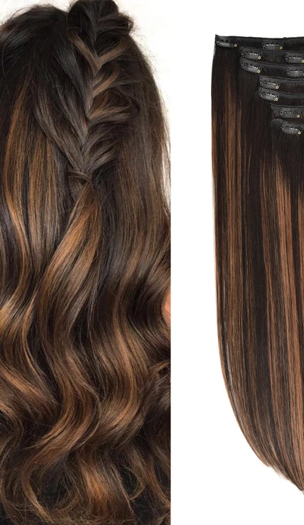 High-quality clip in hair extensions made of silky remy human hair with discreet silicon-backed clips for natural volume and length.